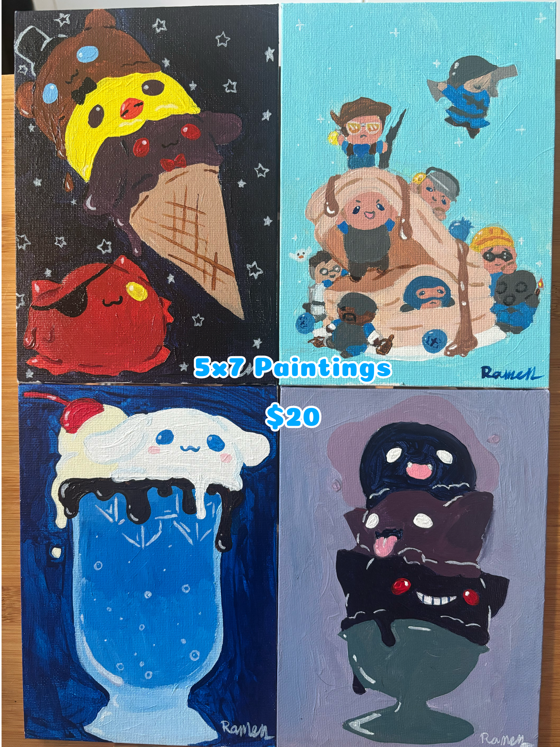 5x7 Paintings of various characters and fandoms.